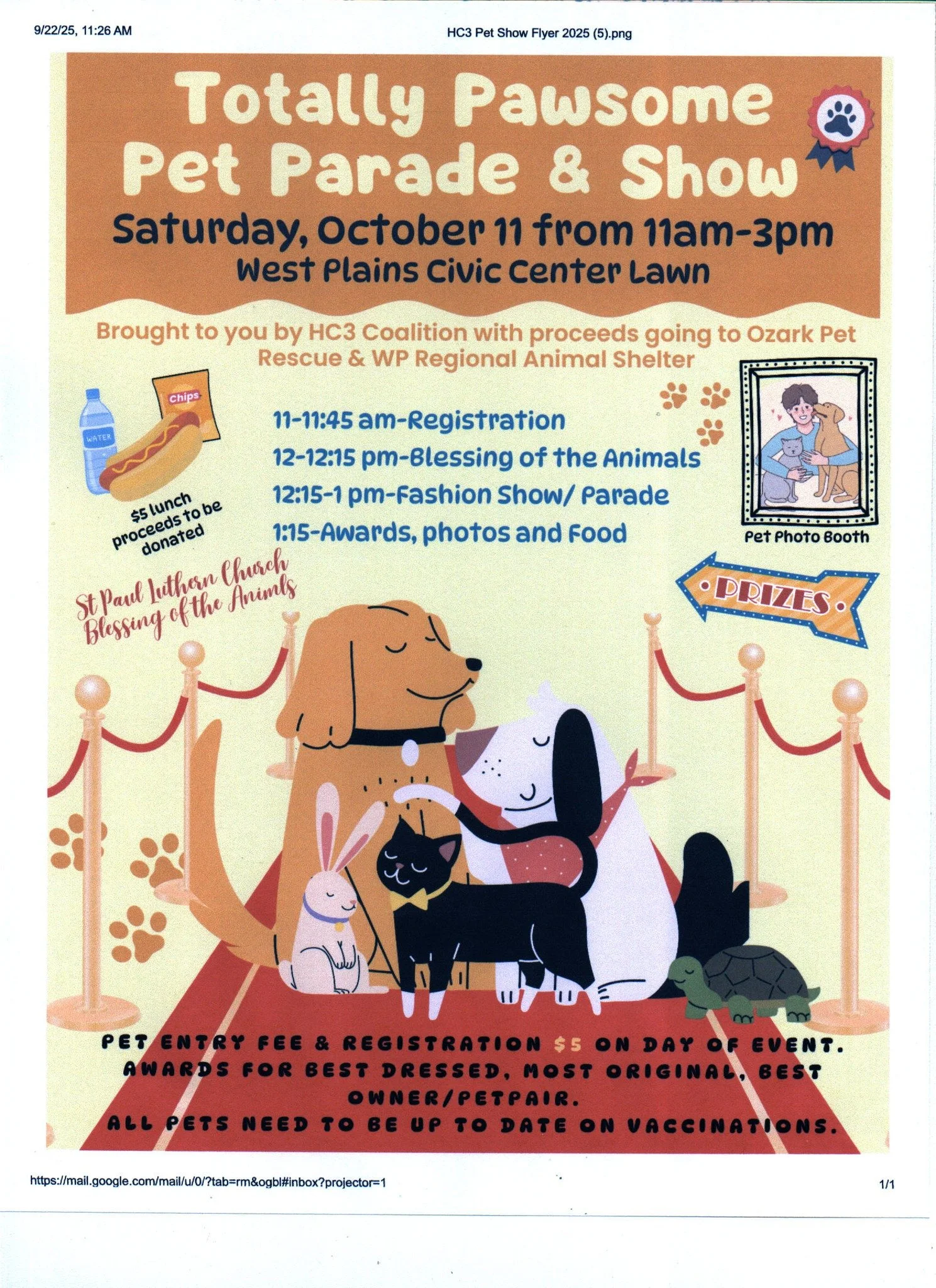 The Howell County Community (HC3) will host a “Totally Pawsome” Pet Parade & Show from 11 a.m. to 3 p.m., Oct. 11, on the West Plains Civic Center lawn on East Main Street off of St. Louis Street. Proceeds from the event will benefit Ozark Pet Rescue and the West Plains Regional Animal Shelter.